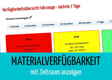 Die Materialverfügbarkeitsübersicht wurde erweitert und intergriert nun auch zukünftige Material- und Fahrzeugbuchungen in die Anzeige. Dabei ist ein Zeitraum von bis zu 7 Tagen möglich. So kann man bspw. sehen, welche Fahrzeuge für einen spontanen Einsatz zur Verfügung stehen.