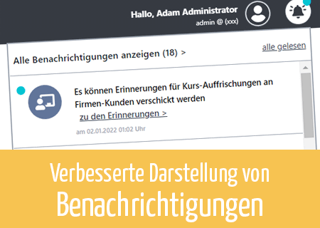 Ein neuer Navigationsbereich am oberen Bildschirmrand begrüßt nun den aktuellen User und zeigt auch den Benutzernamen an. Mit Klick auf das Icon öffnet sich ein Menü mit Link zum Benutzerkonto und Möglichkeit zum Logout. Rechts daneben gibt es eine kleine Glocke. Sie weist darauf hin, wenn es neue Benachrichtigungen im System gibt. Auch hier öffnet sich auf Klick eine Box, in der die neuen Benachrichtigungen angezeigt werden.