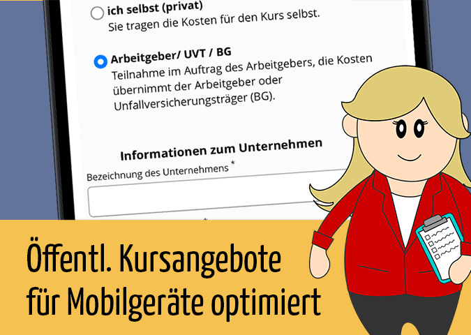 Da eine Anmeldung immer häufiger über mobile Endgeräte erfolgt, haben wir die Ansicht der öffentlichen Kursangebote überarbeitet und mobil optimiert. Inhalte werden nun auch auf kleinen Bildschirmen gut lesbar dargestellt und Formulare können einfacher ausgefüllt und abgeschickt werden.