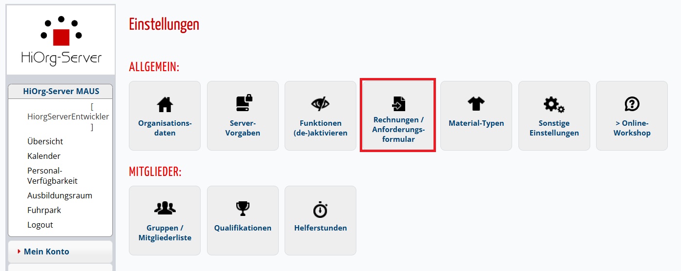 System → Einstellungen → Rechnungen / Anforderungsformular